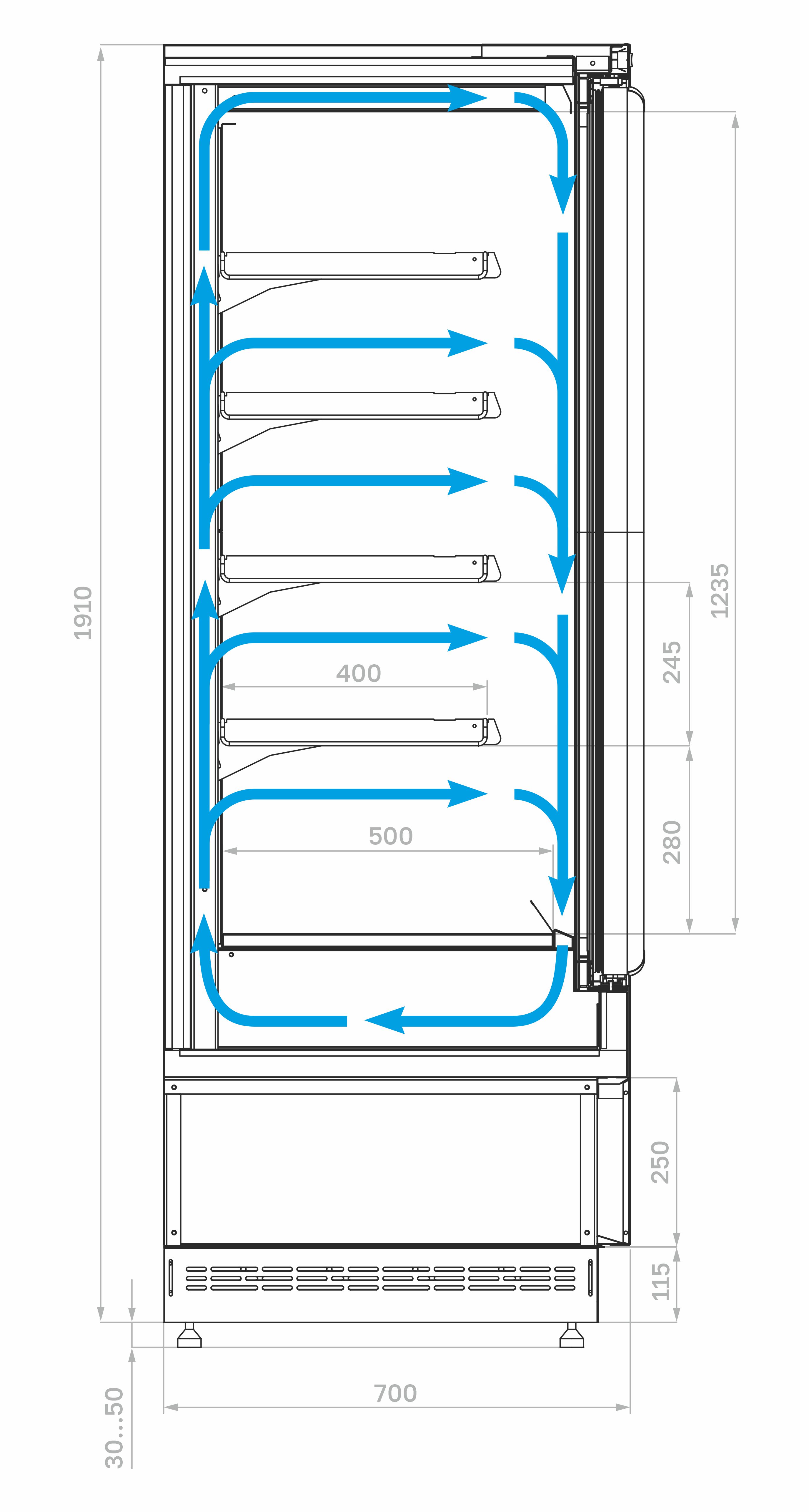 • Глубина выкладки: навесные полки — 400 мм, донная — 500 мм