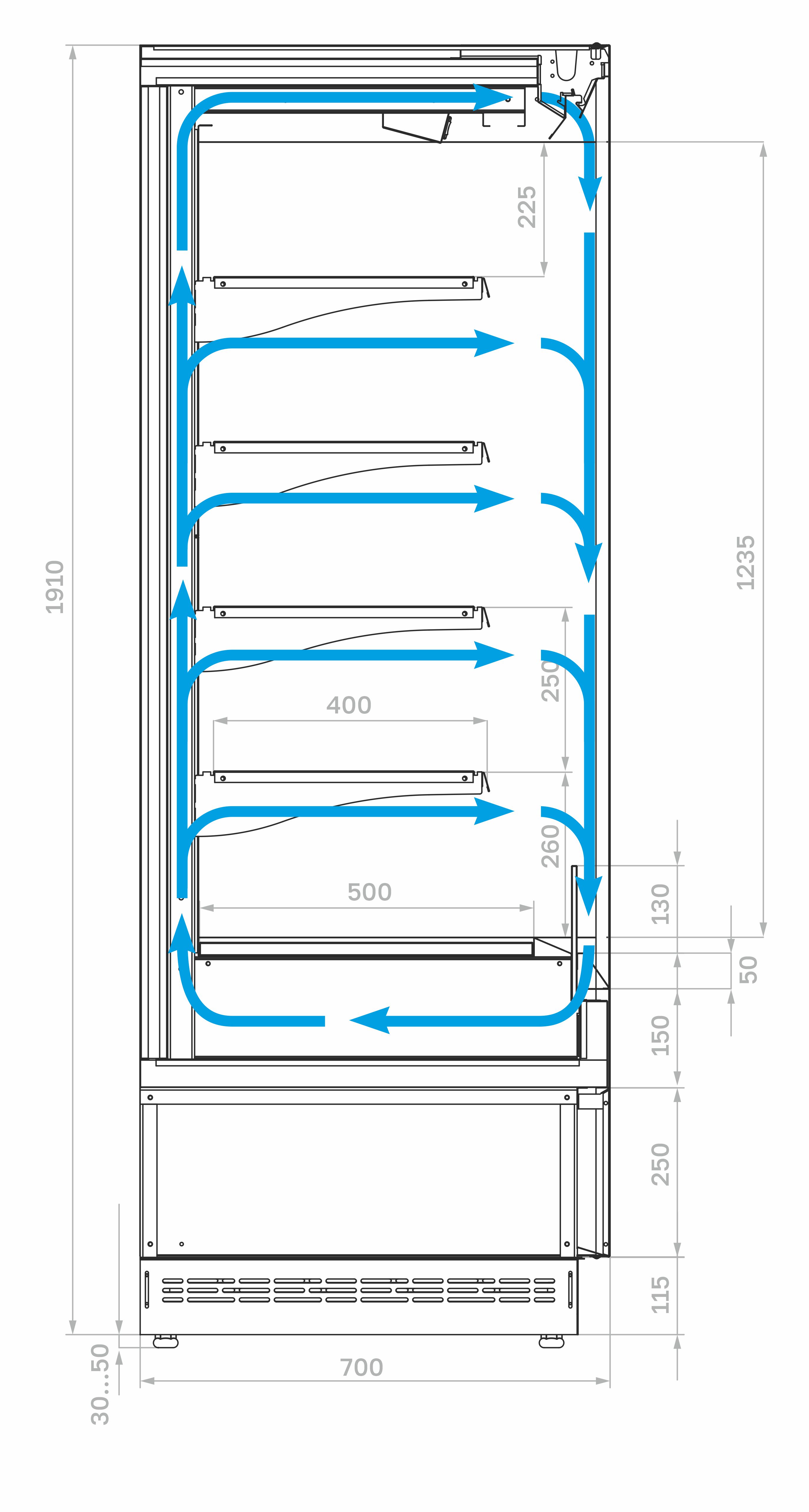 • Глубина выкладки: навесные полки — 400 мм, донная — 500 мм