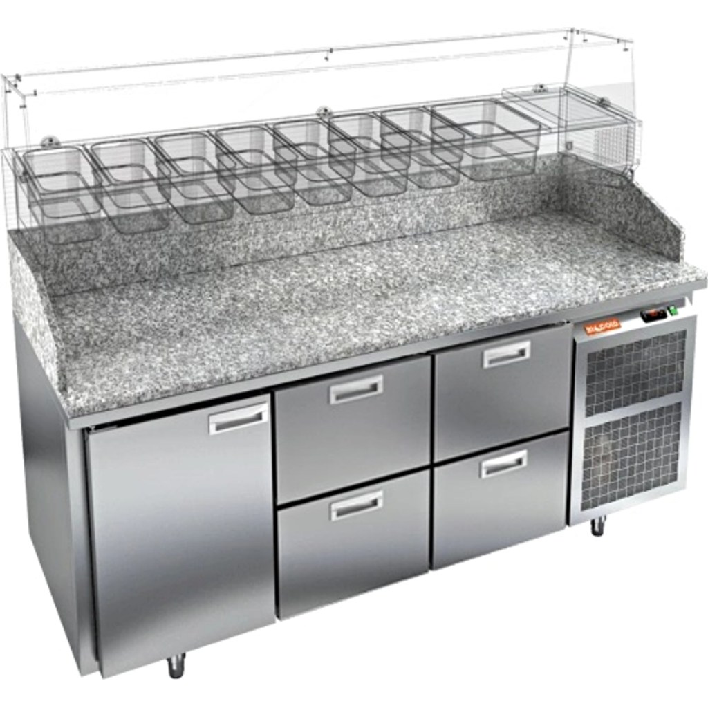 Каталог оборудования Холодильное оборудованиеСтолы охлаждаемыеСтолы холодильные для пиццыСтол холодильный для пиццы HiCold PZ3-122/GN камень Стол холодильный для пиццы HiCold PZ3-122/GN камень Код товара: 065-008 Поделиться: WhatsAppTelegram СравнитьДобавить в КПВ избранное 0 327 952 ₽ В корзину 0 шт Под заказСамовывоз сегодня бесплатно Взять в кредит Купить в лизинг Получить консультацию в Max Описание Характеристики Отзывы 0 Стол холодильный для пиццы HiCold PZE3-122/GN камень предназначен для использования в пиццериях, кафе, магазинах и ресторанах. Он идеально подходит для раскатки теста, подготовки ингредиентов и кратковременного хранения скоропортящихся продуктов. Витрина приобретается отдельно. Стол сочетает корпус из нержавеющей стали и гранитную столешницу, которая устойчива к механическим и температурным нагрузкам и удобна в работе с тестом. Такая конструкция обеспечивает долговечность, гигиеничность и простоту ухода. Особенности модели: Охлаждение: динамическое — равномерное поддержание температуры Оттайка: автоматическая — удобство и экономия времени Панель управления: электронная — точная настройка температуры Ножки: регулируемые по высоте — устойчивость на неровной поверхности Двери: 1 глухая дверца с автоматическими доводчиками и фиксатором открытого положения Ящики: 4 выдвижных ящика — удобное хранение ингредиентов Уплотнители: легкозаменяемые магнитные — герметичность и простота обслуживания Толщина теплоизоляции: 50 мм — сохранение холода и энергоэффективность Рабочая поверхность: глубина 680 мм — удобство работы HiCold PZE3-122/GN камень— это надёжный и функциональный холодильный стол для пиццы, который сочетает прочность, эргономику и эффективное охлаждение. Благодаря гранитной столешнице, корпусу из нержавеющей стали, двум глухим дверям и двум выдвижным ящикам он станет универсальным решением для профессиональной кухни. Изображение товара, представленного на фото, может отличаться от его фактического вида. Показать все Габаритные размеры1835×700×1050 ммДиапазон рабочей температурыот +2 до +10 °CРасположение агрегатаБоковое Материал столешницыГранитная Тип столаС дверьми и ящиками Тип двериГлухая Объём505 лКоличество дверей1 штКоличество ящиков4 штРазмер полки530×325 ммНапряжение220 ВМощность0,5 кВтТип охлажденияДинамическое Тип оттайкиАвтоматическая Габариты в упаковке2000×850×1180 ммВес нетто172 кгВес брутто192 кгБрендHicoldВсе холодильные столы для пиццы HicoldВсе нержавеющие холодильные столы для пиццы Оставить отзыв Еще никто не оставил отзыв на этот товар Ранее просмотрено Под заказ 263 692 ₽ Стол холодильный для пиццы HiCold PZ3-13/SN камень Под заказ 224 181 ₽ Стол холодильный для пиццы HiCold PZ2-111GN (1/6) стекло
