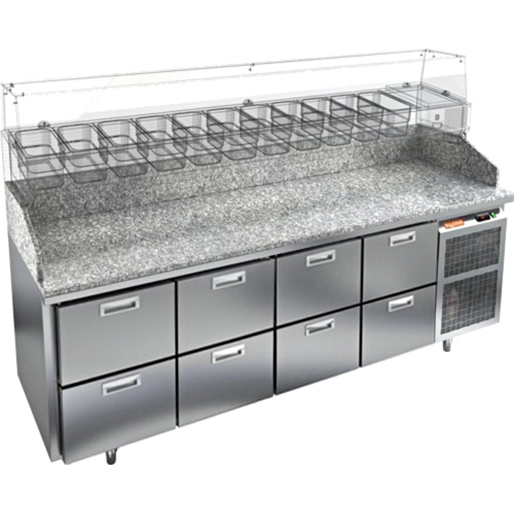 Каталог оборудования Холодильное оборудованиеСтолы охлаждаемыеСтолы холодильные для пиццыСтол холодильный для пиццы HiCold PZ3-2222/GN камень Стол холодильный для пиццы HiCold PZ3-2222/GN камень Код товара: 065-016 Поделиться: WhatsAppTelegram СравнитьДобавить в КПВ избранное 0 406 521 ₽ В корзину 0 шт Под заказСамовывоз сегодня бесплатно Взять в кредит Купить в лизинг Получить консультацию в WhatsApp Описание Характеристики Отзывы 0 Стол холодильный для пиццы HiCold PZE3-2222/GN камень предназначен для использования в пиццериях, кафе, магазинах и ресторанах. Он идеально подходит для раскатки теста, подготовки ингредиентов и кратковременного хранения скоропортящихся продуктов. Витрина приобретается отдельно. Стол сочетает корпус из нержавеющей стали и гранитную столешницу, которая устойчива к механическим и температурным нагрузкам и удобна в работе с тестом. Такая конструкция обеспечивает долговечность, гигиеничность и простоту ухода. Особенности модели: Охлаждение: динамическое — равномерное поддержание температуры Оттайка: автоматическая — удобство и экономия времени Панель управления: электронная — точная настройка температуры Ножки: регулируемые по высоте — устойчивость на неровной поверхности Ящики: 8 выдвижных ящика — удобное хранение ингредиентов Уплотнители: легкозаменяемые магнитные — герметичность и простота обслуживания Толщина теплоизоляции: 50 мм — сохранение холода и энергоэффективность Рабочая поверхность: глубина 680 мм — удобство работы HiCold PZE3-2222/GN камень— это надёжный и функциональный холодильный стол для пиццы, который сочетает прочность, эргономику и эффективное охлаждение. Благодаря гранитной столешнице, корпусу из нержавеющей стали, двум глухим дверям и двум выдвижным ящикам он станет универсальным решением для профессиональной кухни. Изображение товара, представленного на фото, может отличаться от его фактического вида. Показать все Габаритные размеры2280×700×1050 ммДиапазон рабочей температурыот +2 до +10 °CРасположение агрегатаБоковое Материал столешницыГранитная Тип столаС ящиками Объём660 лКоличество ящиков8 штРазмер полки530×325 ммНапряжение220 ВМощность0,5 кВтТип охлажденияДинамическое Тип оттайкиАвтоматическая Габариты в упаковке2430×850×1140 ммВес нетто270 кгВес брутто320 кгБрендHicoldВсе холодильные столы для пиццы HicoldВсе нержавеющие холодильные столы для пиццы Оставить отзыв Еще никто не оставил отзыв на этот товар Ранее просмотрено Под заказ 373 852 ₽ Стол холодильный для пиццы HiCold PZ3-223/GN камень Под заказ 330 021 ₽ Стол холодильный для пиццы HiCold PZ3-1113/GN камень