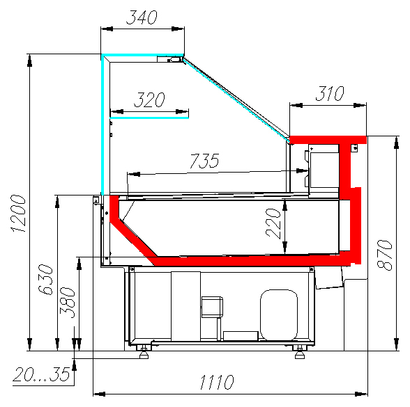 Данная витрина оснащена регулируемыми ножками высотой от 20 до 35 мм, что позволяет подстраивать высоту под условия установки. Поверхность выкладки и столешница изготовлены из шлифованной нержавеющей стали, обеспечивая долговечность и простоту ухода.