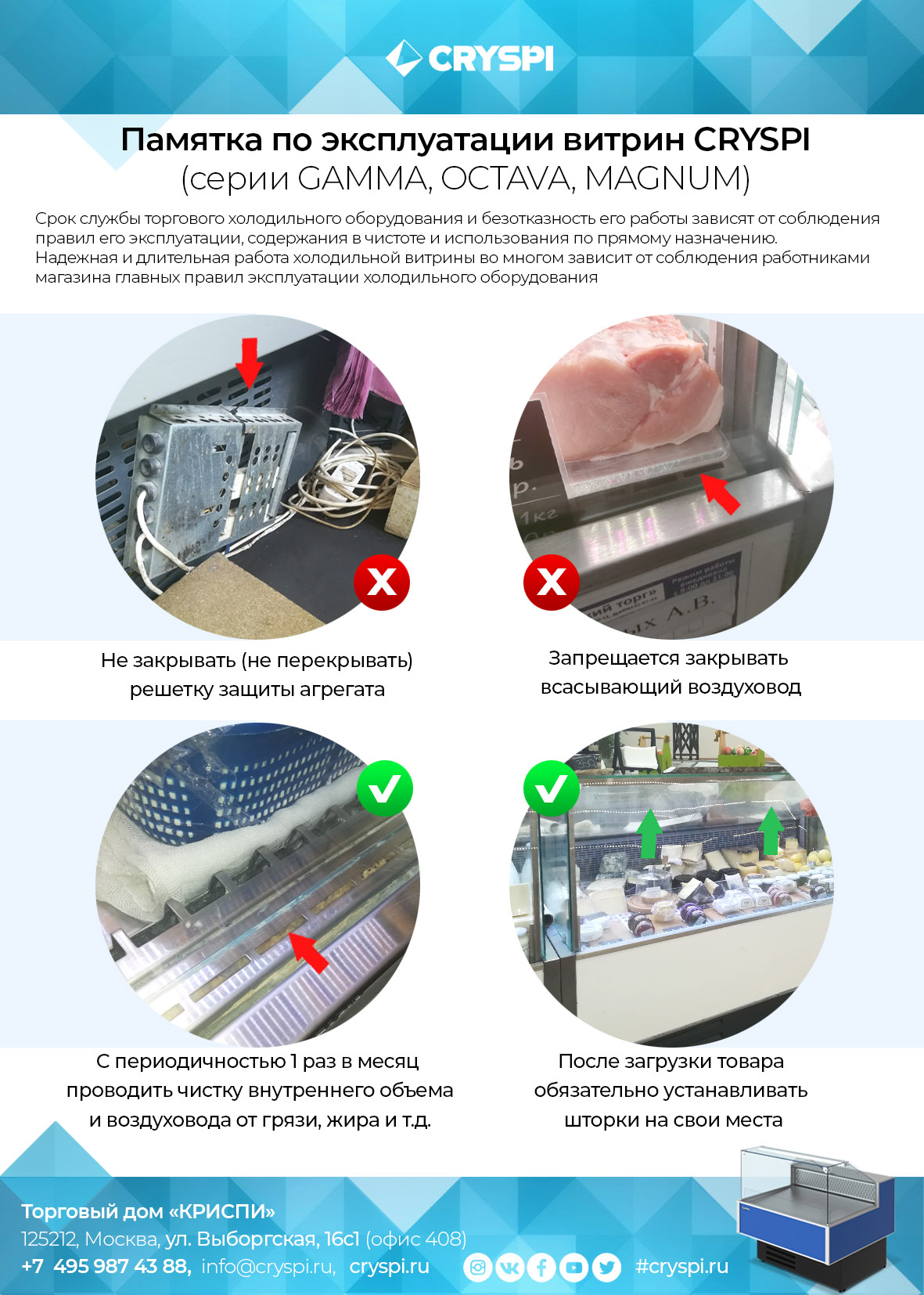 В стандартную комплектацию входят ночные шторки из оргстекла и ёмкость для сбора талой воды, что повышает удобство обслуживания и энергоэффективность оборудования.